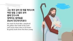 2) 둘, “어린양을 그 팔로 모아 품에 안으시며”(사40:11b); 양을 맹수로부터 보호하는 것이 목자의 일입니다(삼상17:34-36, 요10:11-15). 특히 대항능력이 약한 어린양을 먼저 보호해야 합니다. 그리스도는 참으로 좋은 목자입니다. 어린양을 모두 그 품에 안으시며 강력하게 보호하십니다. 그리고 잘 키워서 능히 원수와 그리고 세상과 싸워서 승리를 얻도록 양육하십니다(요16:23-24, 33, 17:15).