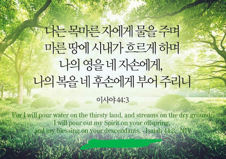 3) 셋, “나의 영을 네 자손에게”(사44:3c); 가장 큰 축복은 하나님께서 구원자 메시아를 보내어 주시는 것입니다. 메시아가 “세상 죄를 지고 가는 하나님의 어린양”(요1:29)이 되심으로 그 대속의 은혜를 믿고 회개하는 죄인은 모두 의인으로 간주가 됩니다. 특히 남은 인생을 그리스도의 구원의 복음을 온세상에 전하고자 결심하는 성도들에게는 하나님의 영이 임재하게 됩니다(욜2:28, 요14:16-20, 행1:8). 이사야는 그 은혜가 이스라엘 자손들에게도 있게 될 것임을 여기서 예언하고 있는 것입니다.