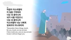 1) 하나, “21. 야곱아 이스라엘아 이 일을 기억하라. 너는 내 종이니라”(사44:21a); 야곱 곧 세상적인 꾀를 따라서 살고 있던 자라고 하더라도(창25:31-34, 27:11-19) 여호와 하나님의 종입니다. 거룩한 하나님의 대족장으로(창32:28, 35:10, 47:7, 10, 48:22) 살아가는 자라고 하더라도 여전히 하나님의 종입니다. 나아가서 선민 이스라엘(출19:5-6)이나 새로운 이스라엘(마28:18-20, 눅24:445-49, 행1:8)이나 모두 창조주 하나님의 종이라는 사실에는 변함이 없다는 것입니다(사44:21a).