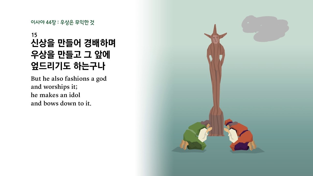 (2) 둘째, 사람이 만든 우상들이 그러한 새로운 구원의 시대를 예언하거나 도래하게 할 수가 없습니다(사44:9-20). 철로 만든 신상이라고 하더라도 피조물인 장인이 만든 쇳덩어리에 불과하므로 사람의 힘 이상으로 힘을 쓸 수 있는 존재가 아닙니다(사44:12). 그리고 나무로 조각하여 만든 신상은 그 재질이 불을 피우는 장작과 같을 뿐입니다(사44:15-17).
