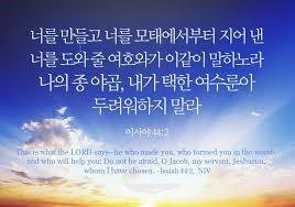 (3) 둘째, 제2절입니다; “2. (a)너를 만들고 너를 모태에서 지어낸 너를 도와줄 여호와가 이같이 말하노라. (b)나의 종 야곱, 내가 택한 여수룬아 두려워하지 말라”(사44:2); 여기서 이사야는 먼저 창조주가 만드신 전체 인류에 대하여 말하고 있습니다. 창조주이시기에 여호와 하나님은 선민과 이방인을 구별하지 아니하고 모두를 도와주고 구원해 주신다는 것입니다. 그 다음에는 특히 그의 동족인 이스라엘 자손에 대하여 말하고 있습니다. 그 내용이 다음과 같습니다;