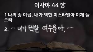 본문 제1절에서 선지자 이사야는 익숙한 표현을 사용하여, “1. 나의 종 야곱, 내가 택한 이스라엘아 이제 들으라”(사44:1)고 여호와로부터 받은 그의 예언을 기록하기 시작하고 있습니다.