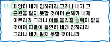 (5) 둘째, 제11절입니다; “11. (a)재앙이 네게 임하리라. 그러나 네가 그 근원을 알지 못할 것이며, (b) 손해가 네게 이르리라. 그러나 이를 물리칠 능력이 없을 것이며, (c) 파멸이 홀연히 네게 임하리라. 그러나 네가 알지 못할 것이니라”(사47:11);