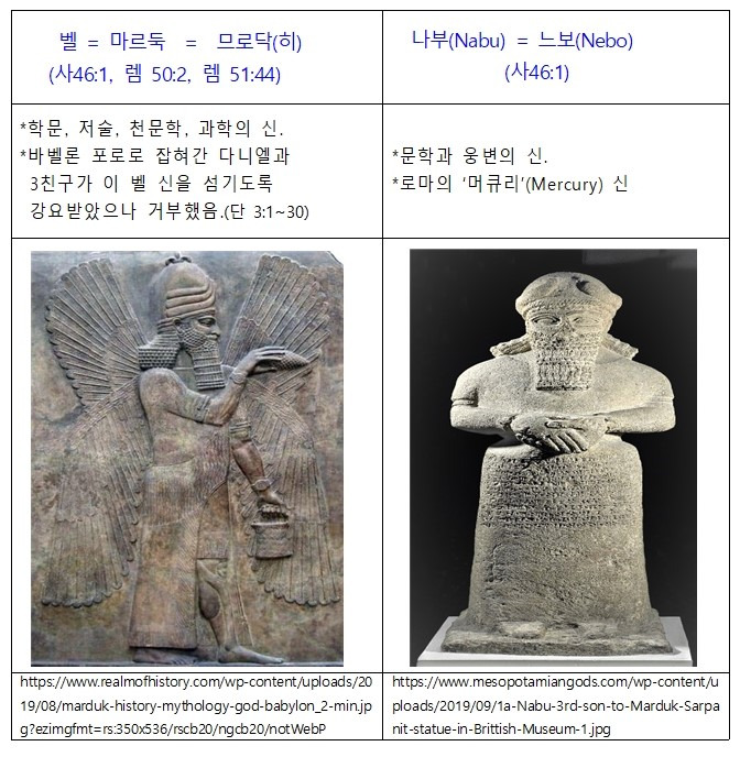 1) 하나, “1. 벨은 엎드러졌고 느보는 구부러졌도다”(사46:1a); 우상문화의 최후를 이사야가 예언하고 있는 대목입니다. 바벨론의 주신인 벨과 주신의 아들인 느보 신이 모두 여호와 하나님의 징벌을 받아 패망하고 있습니다. 그 모습을 이사야가 엎드러지고 구부러졌다고 표현하고 있는 것입니다;