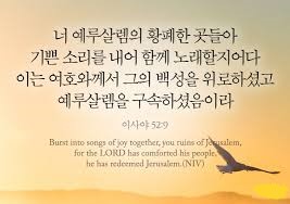 (11) 셋째, 제9절입니다; “9. (a)너 예루살렘의 황폐한 곳들아, 기쁜 소리를 내어 함께 노래할지어다. (b)이는 여호와께서 그의 백성을 위로하셨고 예루살렘을 구속하셨음이라”(사52:9); 예루살렘을 구속하시고 백성들을 위로하시는 하나님을 찬양하라고 이사야는 다음과 같이 말하고 있습니다;
