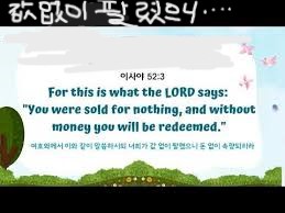 1) 하나, “3. 여호와께서 이와 같이 말씀하시되, 너희가 값없이 팔렸으니”(사52:3a); 노예는 돈을 주고 사는 것입니다. 그러므로 노예는 몸값을 지니고 있습니다. 예를 들면, 고대 중동사회에서 장정노예는 그 몸값이 은 30세겔입니다. 여자노예는 20세겔입니다. 그런데 선민 이스라엘 자손들이 하나님을 떠나 영적으로 타락하여 세상에서 이방신들을 섬기며 우상문화의 노예로 살고 있습니다. 하나님이 자신의 백성을 돈을 받고 판 적이 없는데 그들이 스스로 값없이 세상의 노예가 되어 살아가고 있는 것입니다(사52:3a).
