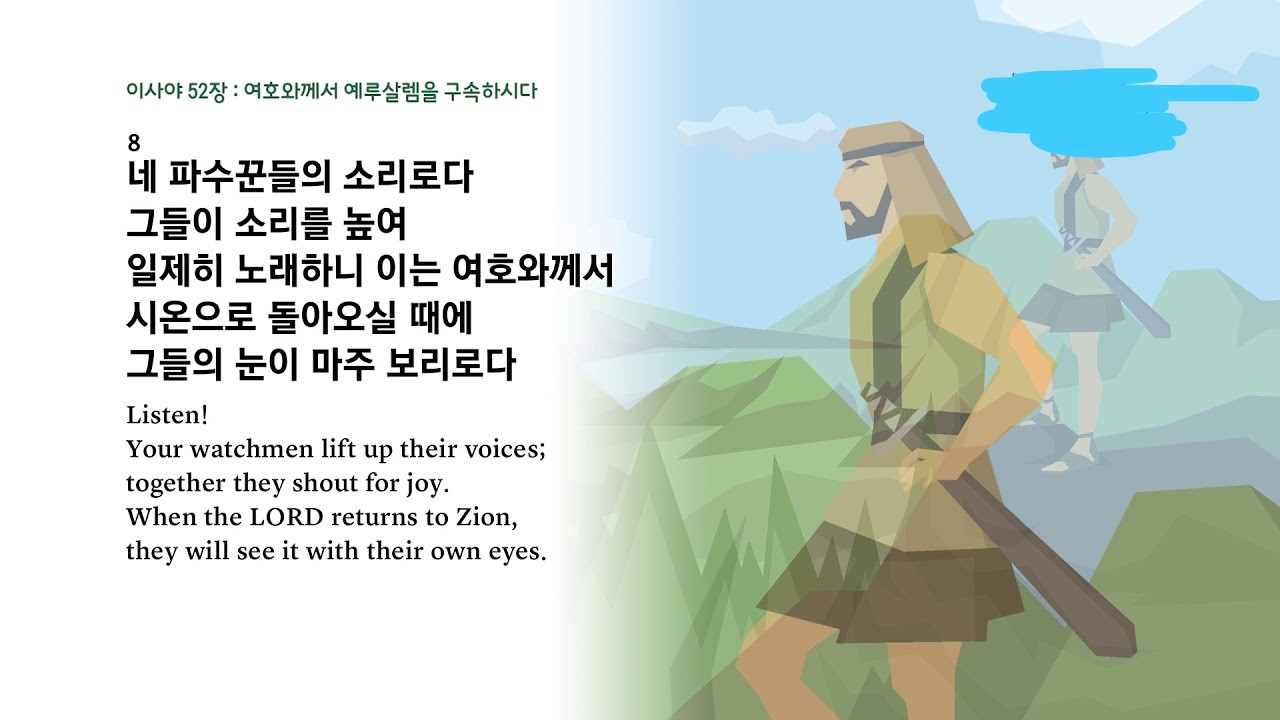 1) 하나, “8. 네 파수꾼의 소리로다. 그들이 소리를 높여 일제히 노래하니”(사52:8a); 파수꾼은 모두가 잠을 자고 있는 동안에도 불침번을 서고 있습니다. 그리고 진영 안으로 들어오는 길목에서 번을 서고 있습니다. 그러므로 진영의 바깥에서 발생하고 있는 상황의 변화를 가장 먼저 접할 수 있는 자입니다. 그들 파수꾼들이 복된 소식을 먼저 접하고 있습니다. 여호와 하나님께서 백성들의 죄를 용서하고 구원을 베풀기 위하여 걸음하시고 있다는 것입니다. 그래서 그들은 너무나 즐거워 일제히 노래하며 여호와를 찬양하고 있습니다(사52:8a).