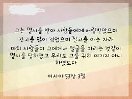 (4) 셋째, 제3절입니다; “3. (a)그는 멸시를 받아 사람들에게 버림받았으며, (b)간고(艱苦, 생활상의 어려움과 고통)를 많이 겪었으며, 질고(疾苦, 육체적인 괴로움과 고통)를 아는 자라. (c)마치 사람들이 그에게서 얼굴을 가리는 것같이 멸시를 당하였고, (d)우리도 그를 귀히 여기지 아니하였도다”(사53:3); 여호와의 종으로 이 세상에 오시는 메시아가 이 땅에서 겪게 되는 멸시, 배척, 간고, 질고, 외면, 천대 등 6가지의 고통을 이사야가 적나라하게 예언하고 있습니다;