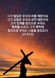 2) 둘, “그가 징계를 받으므로 우리는 평화를 누리고”(사53:5b); 메시아가 자신을 세상죄를 지고 가는 희생 제물인 어린양으로 하나님 앞에 내어놓습니다(요1:29). 그 결과 어린양이 징계받음으로 말미암아 그 양에게 죄짐을 맡긴 백성들이 사함을 얻으며 하나님과 평화를 누리게 됩니다(롬5:1);