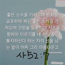 (9) 첫째, 제7절입니다; “7. (a)좋은 소식을 전하며 평화를 공포하며, (b)복된 좋은 소식을 가져오며 구원을 공포하며, (c)시온을 향하여 이르기를, 네 하나님이 통치하신다 하는 자의, (d)산을 넘는 발이 어찌 그리 아름다운가?”(사52:7); 세상의 좋은 소식과 구별되는 하나님의 복음에 대하여 이사야가 다음과 같이 진술하고 있습니다;