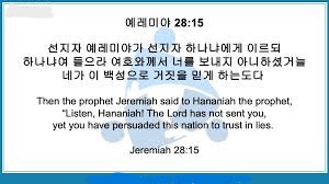 (4) 첫째, 제15절입니다; “15. 선지자 예레미야가 선지자 하나냐에게 이르되, 하나냐여 들으라, 여호와께서 너를 보내지 아니하셨거늘, 네가 이 백성에게 거짓을 믿게 하는 도다”(렘28:15); 다음과 같이 두 부분으로 나누어서 살펴보고자 합니다;
