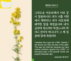 (3) 본문의 말미인 제15-17절에서 선지자 예레미야가 제멋대로 권력자의 비위를 맞추어 거짓 예언을 행한 하나냐가 받게 되는 여호와의 보응이 어떠한 것인지 정확하게 기록하고 있습니다. 곧바로 구절풀이에 들어가겠습니다;