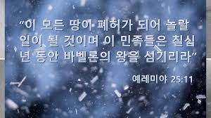 (10) 첫째, 제12절입니다; “12. 여호와의 말씀이니라. 70년이 끝나면, 내가 바벨론의 왕과 그의 나라와 갈대아인의 땅을 그 죄악으로 말미암아 벌하여 영원히 폐허가 되게 하되”(렘25:12); 다음과 같이 두 부분으로 나누어서 살펴보고자 합니다;