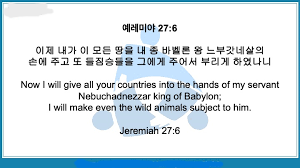 (4) 셋째, 제6-7절입니다; “6. 이제 내가 이 모든 땅을 내 종 바벨론의 왕 느부갓네살의 손에 주고 또 들짐승들을 그에게 주어서 섬기게 하였나니, 7. 모든 나라가 그와 그의 아들과 손자를 그 땅의 기한이 이르기까지 섬기리라. 또한 많은 나라들과 큰 왕들이 그 자신을 섬기리라”(렘27:6-7); 다음과 같이 3부분으로 나누어서 살펴봅니다;