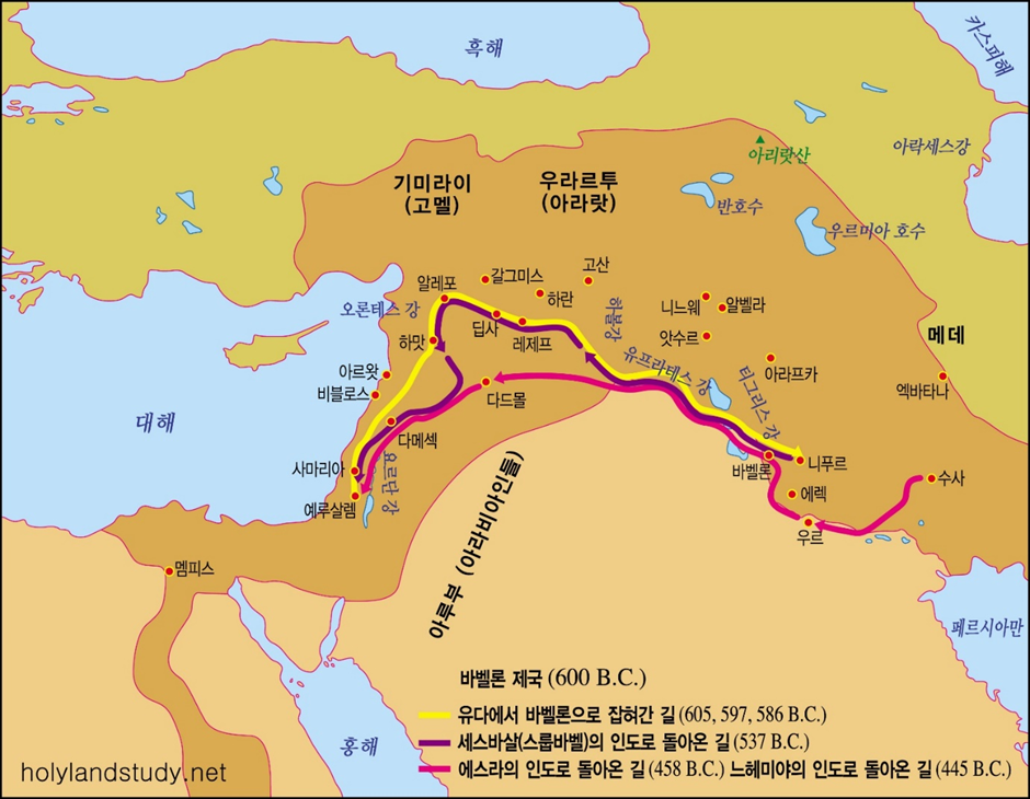 4) 둘, “22. 그것들이 바벨론으로 옮겨지고, 내가 그것을 돌보는 날까지 거기에 있을 것이니라”(렘27:22a); 다윗왕조 유대왕국이 멸망하고 전란 가운데 살아 남은 유대인들이 망국의 백성이 되어 오랜 세월 이방 땅을 떠돌게 될 것입니다. 그들에게는 과거 여호와를 하나님으로 섬기던 신앙의 자취가 남아 있습니다. 히브리경전이 율법서와 더불어 그들에 의하여 보전되고 재생됩니다(롬3:1-2, 9:4-6). 그 내용은 의미상 크게 보아 두가지입니다; 하나는, 성막의 뜰에 있는 물두멍에 손과 발을 씻고 제사장들이 어떠한 마음가짐으로 속죄의 제사를 여호와 하나님께 드려야만 하는지를 말하고 있습니다. 또 하나는, 예루살렘성전과 제사장나라의 기둥을 썩지 않게 어떻게 놋받침을 만들어 사용해야 하는지를 말하고 있습니다. 그러므로 그리스도께서 오시는 그때까지 여호와께서는 여호와신앙과 히브리경전을 보전하시는 것입니다. 그곳이 세상의 제국 바벨론과 그 뒤를 잇고 있는 세상의 제국이라고 하더라도 상관이 없습니다. 그 목적을 이루기 위하여 그들 제국의 역사에 개입하시고 또한 여호와의 뜻대로 섭리를 하실 것입니다(에9:1-19, 단2:37-45, 5:25-31, 롬11:33-36);
